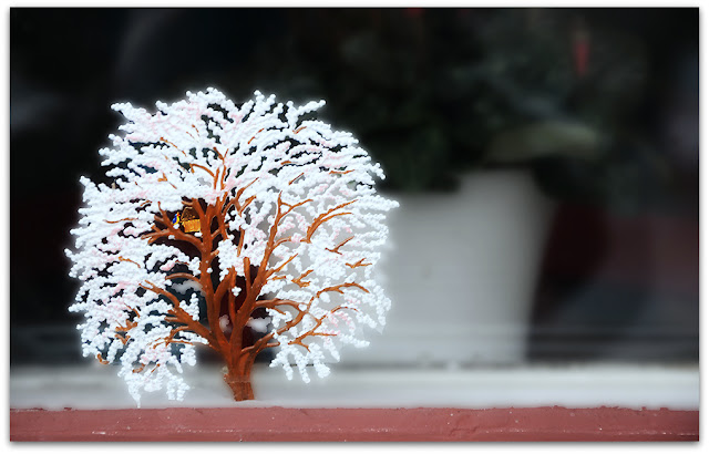 När vi gick därifrån fick jag syn på det här lilla trädet (ser ni den lilla fågelholken och den lilla, lilla, fågeln?) i fönstret och det grå vädret kändes genast lite mindre grått!